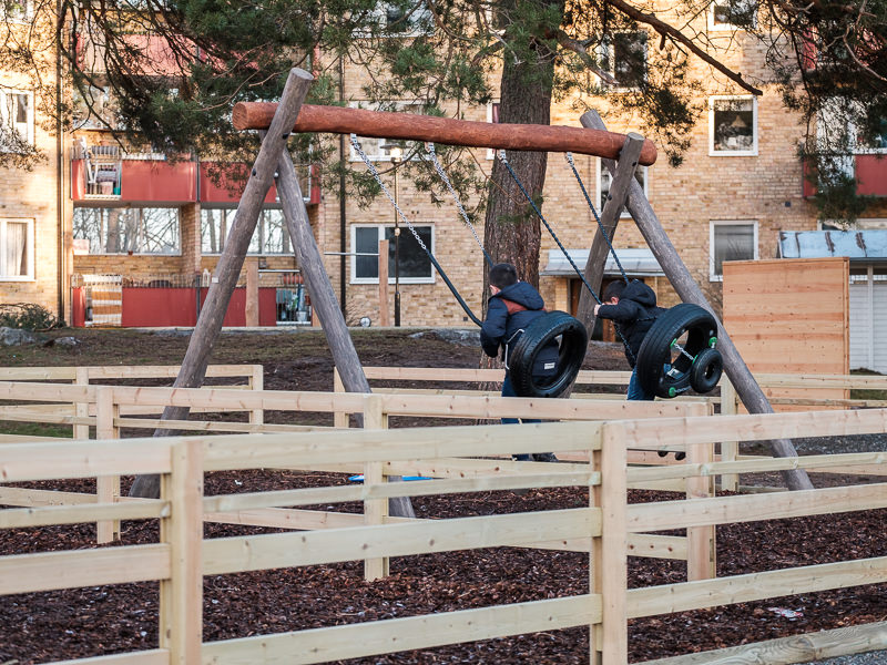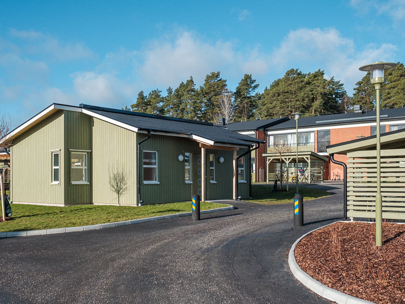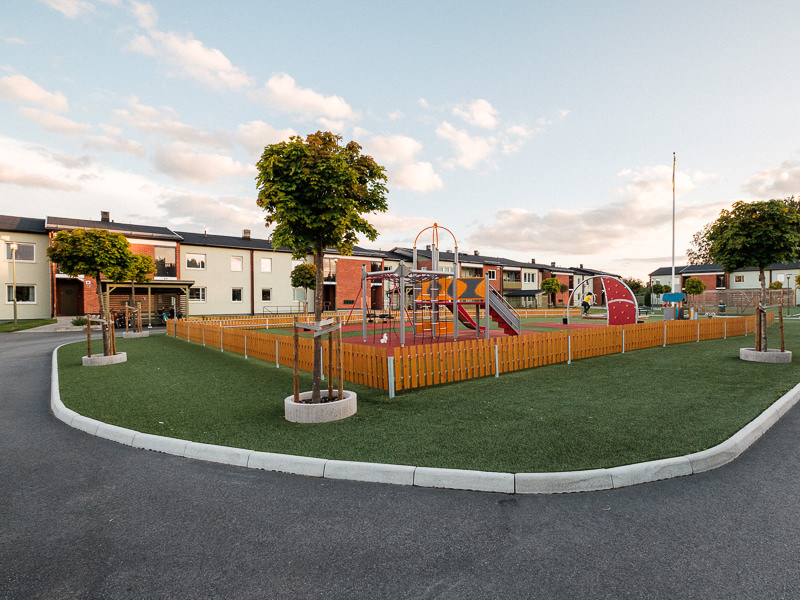 Det är full aktivitet i utkanten av den lilla staden. Fina lägenheter i tvåvåningshus, alla med separat ingång och egen liten trädgård. Flera lekplatser, samlingslokal, förskola samt kyrka finns i området och det är nära till Kvarnarps Gård.